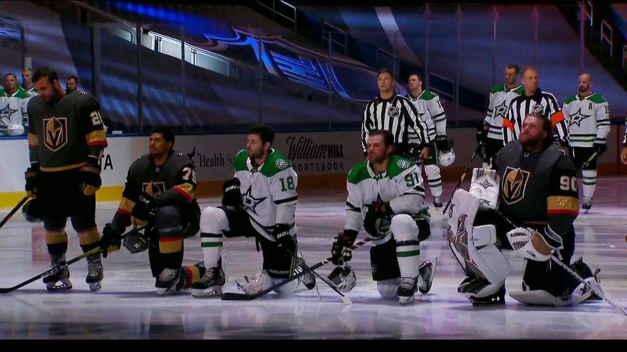 «ryan reaves, jason dickinson, tyler seguin and robin lehner took a knee during the national anthem…»